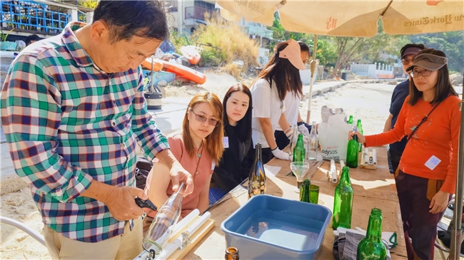 与此同时,道堂亦派出另一支义工队伍,参与由手艺导师Richard教授及SEN(特殊学习需要)手艺学徒带领的工艺工作坊。学员们学习烙画技艺,并将废弃玻璃瓶升级再造,转化为送给区内长者的心意礼物。活动中,义工与有特殊学习需要的朋友共同创作、互动交流,认识到尽管彼此在认知与思维方式上存在差异,却依然能通过手工艺表达情感,建立愉快而有效的沟通。